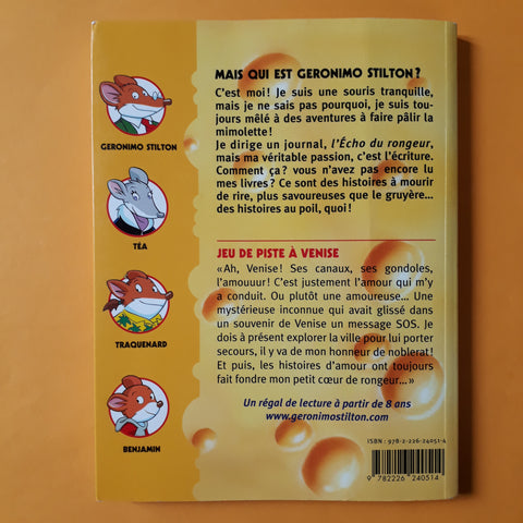 Geronimo rêve d'une balade romantique au coucher du soleil avec la charmante Patty Spring... Au lieu de ça, il se retrouve à l'accompagner au marché aux puces de Sourisia, avec Téa et Pandora ! Et quand il reçoit par hasard un appel au secours d'une inconnue, c'est sans sa bien-aimée qu'il doit partir illico à... Venise, la ville des amoureux !