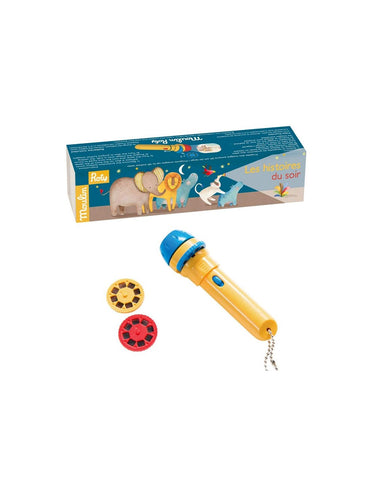 Pour endormir les tout-petits : Lampe torche de poche comprenant trois disques à emboîter. Chacun des disques, projeté sur le mur raconte une histoire en couleurs: