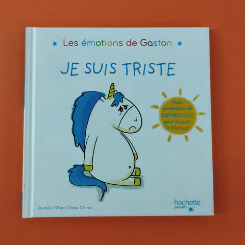 Gaston est une petite licorne différente des autres. Il a une particularité : sa crinière porte les couleurs de l'arc-en-ciel lorsqu'il va bien, mais dès qu'une émotion forte le submerge, sa crinière et sa queue changent de couleur selon son humeur : la tristesse, la colère ou encore la joie par exemple. Une série d'albums écrite et illustrée par Aurélie Chien Chow Chine, sophrologue pour les adultes et les enfants. Elle exerce notamment dans les écoles maternelles. Une émotion par album. Dans celui-ci : la tristesse. À la fin de chaque histoire : des petits gestes magiques (petits exercices très simples) pour aider l'enfant à gérer ses émotions.