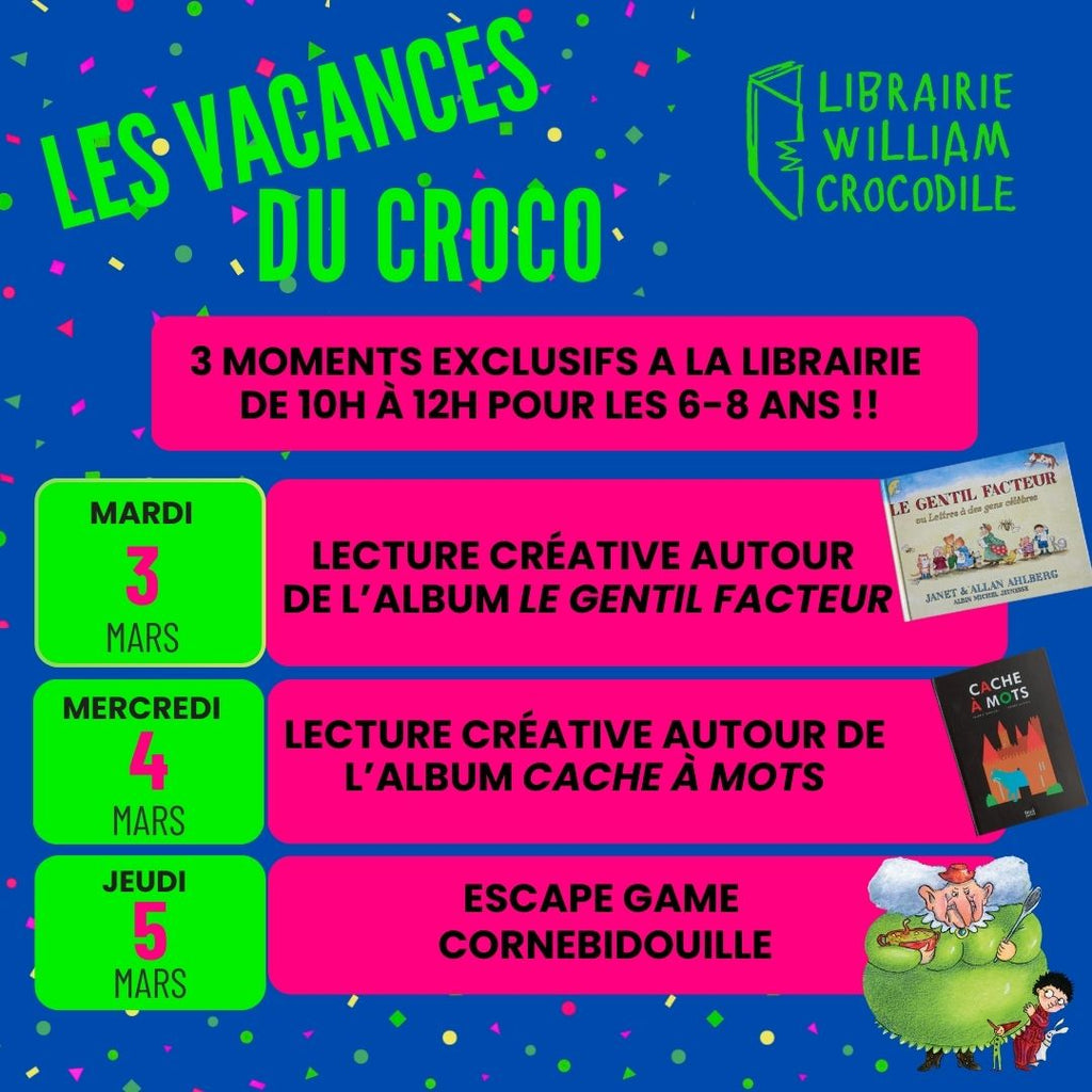 La librairie vous propose 3 moments exclusifs pour les 6-8 ans de 10h à 12h du mardi 3 mars au jeudi 5 mars.