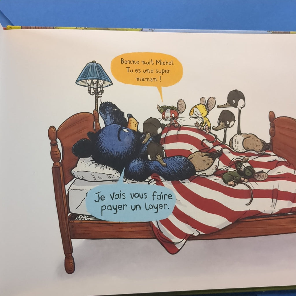 Michel l'ours grincheux habite avec ses oisons adoptifs (car il est leur Maman) et avec trois souris turbulentes (car elles refusent de partir). Michel, qui n'aime rien tant que la solitude, craque. Puisque les souris restent, c'est lui qui part !