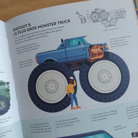 Le plus gros monster truck, la voiture la plus lourde, le plus haut camion, la plus haute grue, le plus gros tracteur, le train le plus puissant, le plus grand paquebot, le plus gros avion, jusqu′à la plus grosse fusée et à l′ISS : tous les engins les plus extraordinaires sont montrés. Un très beau livre cadeau, une fabrication travaillée, et du gaufrage sur la couverture.