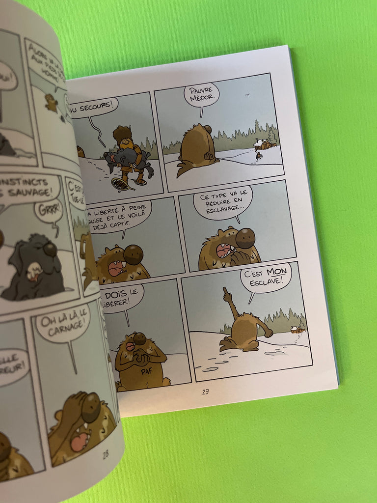 Bagarreur à ses heures mais le plus souvent génial baragouineur, fin tacticien le matin ou menteur patenté le soir, Glouton n’a qu’un seul but : manger le plus possible en faisant le moins d’effort possible ! Pourtant, on aurait pu croire les prédateurs nombreux sur la banquise : ours, loups… Mais si personne n’a jamais pu vérifier ni la force ni l’habilité de Glouton à la baston, c’est qu’il y a une raison : face à cette teigne et ce bonimenteur de génie, personne ne résiste ! Ce premier tome nous amène à découvrir un héro 100% grinçant, qui, égoïste et sans morale, écume le Grand Nord. Et, quand ce solitaire s’entiche d’un chien, Médor, il n’a pas encore décidé s’il allait le manger, en faire un fauteuil… ou un ami ! En attendant, il prétend juste avoir fait caca dessus…