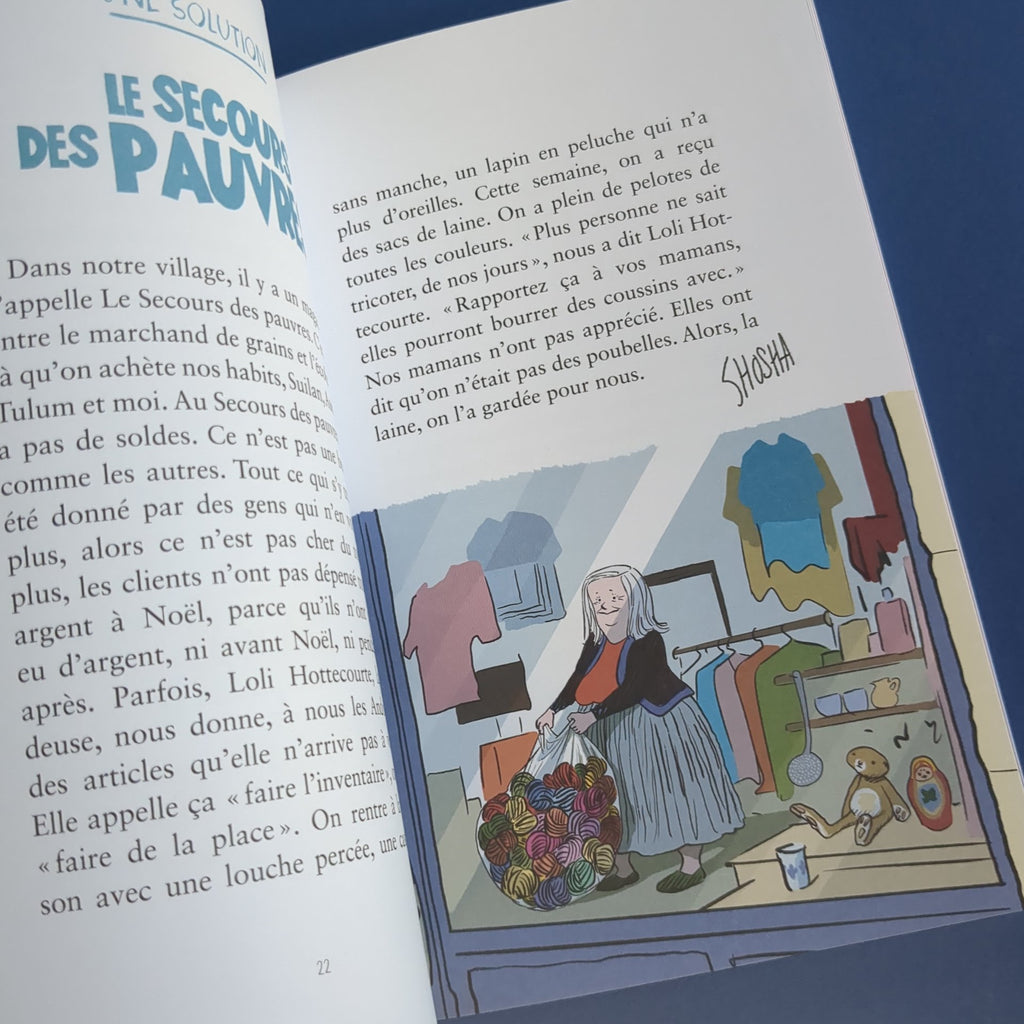 C'est notre ancienne maîtresse qui, la première, nous a appelés les Andouilles, sous prétexte qu'on n'arrivait pas à lire couramment. Les andouilles, ça veut dire les imbéciles, mais dans la vraie vie, c'est un truc qui se mange et qui sent un peu la crotte. Je sais, c'est bizarre, mais dans le journal, on lit toujours des trucs bizarres. Dans le nôtre : que faire quand on s'ennuie ? Où chercher une grand-mère de rêve ? Qu'achète-t-on au Secours des pauvres ? Et bien sûr, une interview de notre super maîtresse. Le premier livre d'une série drôlissime par l'autrice de « l'impossible madame bébé », avec des images de David Prudhomme.