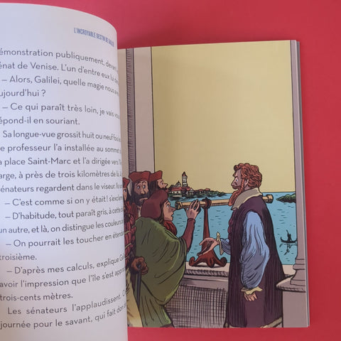 Ce roman tout illustré est agrémenté de pages documentaires pour permettre à l'enfant de comprendre le contexte historique et de mieux situer les découvertes de Galilée.
