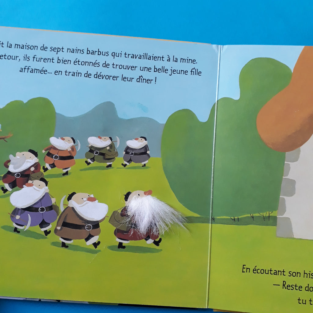 Les matières de cet ouvrage : plastique gonflant et brillant en couverture, miroir, lenticulaire (effet holographique deux images), glitter (yeux d'animaux), toit de paille tressée pour la chaumière, barbe de nain, cape de la sorcière, pomme empoisonnée en vernis pailleté. Avec également un volet-porte et un grand pop-up final qui se déplie.