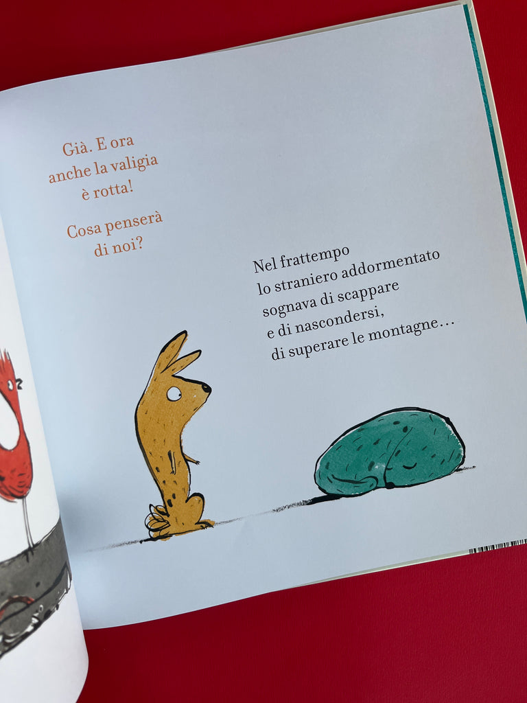Un giorno arriva uno strano animale, impolverato e stanco, con una grossa valigia. cosa ci sarà dentro? La volpe, il coniglio e la gallina sono curiosi e anche diffidenti: cosa ci sarà dentro? Fanno in modo di romperla e… scoprono qualcosa di veramente sorprendente! Cambiano atteggiamento e decidono di “riparare” il danno provocato. E l’amicizia sarà, per lo “strano” animale, una nuova casa. Una storia che con straordinaria immediatezza ed efficacia racconta cose come migrazione, accoglienza, integrazione, intercultura. Perfetta anche a scuola per i percorsi di accoglienza e formazione del gruppo classe a a inizio anno.