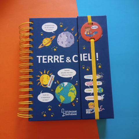 Un ouvrage de 112 pages, qui renferme 212 questions, réparties en 4 thèmes : L'Univers : Qu’est-ce que le big bang ? etc. Le Système solaire : Quelle est la planète la plus proche du Soleil ? etc. La Terre : Qui a découvert que la Terre était ronde ? etc. Les hommes : Qui fut le premier homme dans l'espace ? etc Les 4 parties sont séparées au moyen d’intercalaires permettant d’organiser l’ouvrage de façon très lisible. Un collectif d’illustrateurs : chaque onglet est illustré par un illustrateur différent, donnant ainsi une identité particulièreà chaque partie, le tout mis en page dans une maquette ludique. Un livre-objet original : une reliure spirale, qui permet de manipuler l'ouvrage facilement. un rabat permettant de fermer l’ouvrage, maintenu par un élastique le long duquel coulisse une pastille à positionner dans l’épaisseur du rabat.