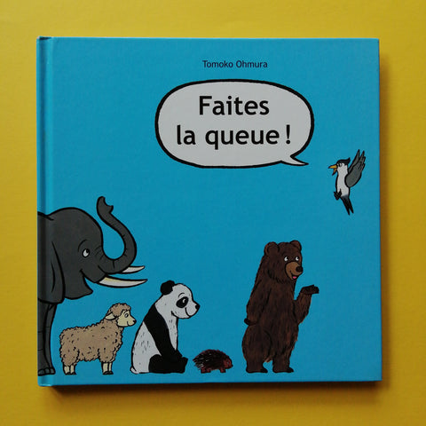 Des animaux bien alignés les uns derrière les autres font la queue pendant qu'un oiseau les survole pour veiller à la discipline. Certains savent pourquoi ils sont là, d'autres pas. Lorsque la hyène et le panda commencent à jouer, les autres les suivent convaincus que le temps passe plus vite en s'amusant.