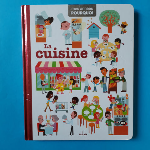 Ce titre est organisé en 4 grandes parties intitulées "Les courses", "La cuisine", "Les repas" et "D'où ça vient ?" qui permettent à l'enfant d'explorer son univers quotidien et de nommer ce qui l'entoure. La première partie fait découvrir à l'enfant les commerces d'alimentation et les produits qu'on y achète : la boulangerie, le marché, la boucherie, le supermarché... La deuxième partie propose au petit curieux de découvrir les ustensiles de cuisine, les gestes du cuisinier, les nombreuses cuissons possibles. La troisième partie présente les différents repas, leur succession dans la journée et les lieux où on les prend : petit déjeuner, déjeuner, gouter, dîner, à la cantine, au restaurant ou à la maison. La dernière partie explique à l'enfant d'où viennent les fruits, les légumes, le pain, les produits laitiers, le chocolat... Sur chaque double page, un bandeau interpelle l'enfant par une question liée à la thématique : quelle est la différence entre une boucherie et une charcuterie ? Pourquoi l'oignon fait-il pleurer ? Un vrai bonus pédagogique ! A la fin de chaque partie, une double page d'auto-évaluation, le "Voyons voir", permet de valoriser l'apprentissage de l'enfant par des activités ludiques.