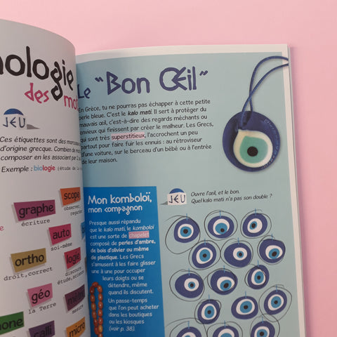 Emmené par Daphné et Manolis, deux petits Grecs d'Athènes, tu vas explorer la Grèce en t'amusant. Dans ce livre rempli de jeux et d'informations, tu vas t'initier à la mythologie et l'étymologie, nager dans la mer Egée et les découvertes d'Archimède, déguster moussaka, feta et baklavas. Tu pourras même participer aux Jeux olympiques ou randonner chez les dieux. De l'Acropole aux Cyclades en passant par la Crète, bon voyage !