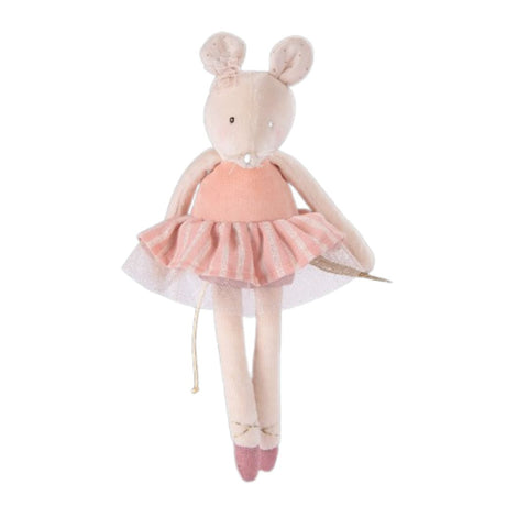 Petite souris en velours au doux visage brodé ! Joues poudrées, jupe tutu rayée rose, petit nœud sur la tête et ballerines nouées, elle est d'une grande élégance. Facile à attraper par les petites mains, elle deviendra le compagnon privilégié de bébé.