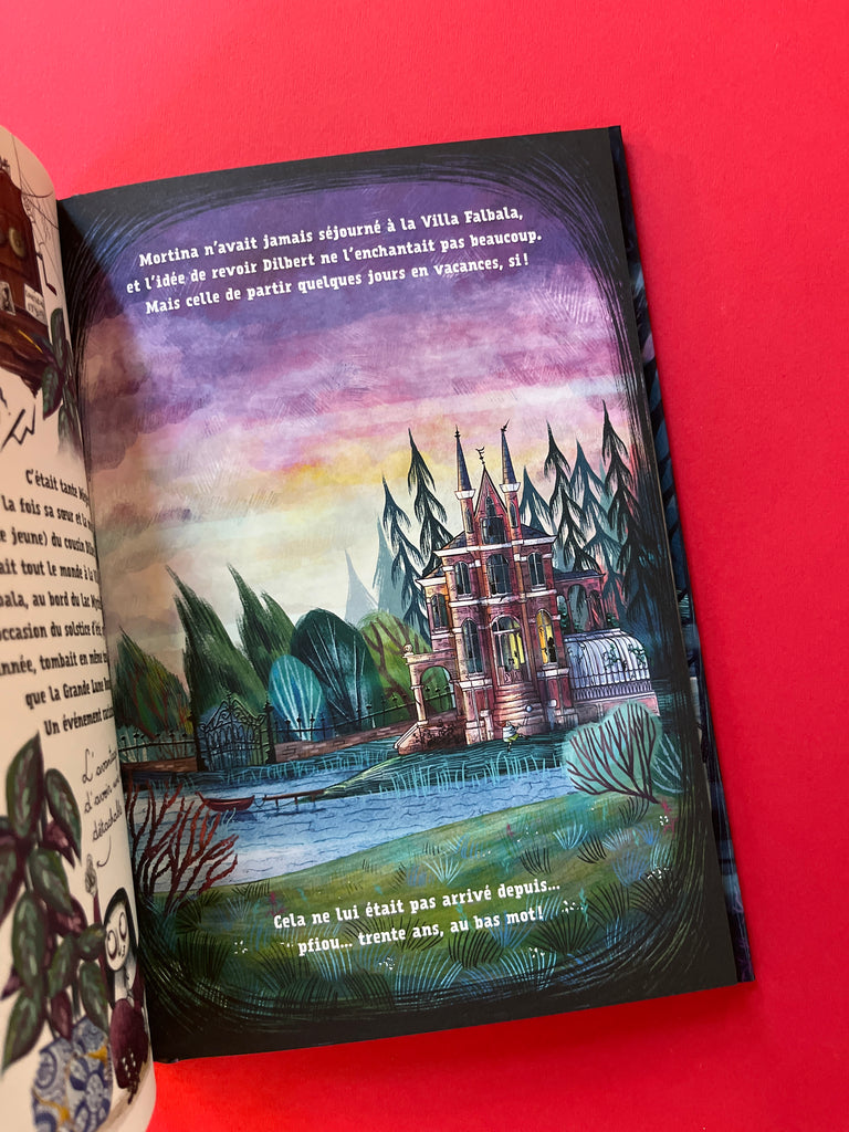 Dring, dring ! De bon matin, le téléphone réveille la torpeur de la villa Décadente. Surprise : Mortina, sa tante Trépassée et leur chien Mouron sont invités chez Dilbert et sa maman, sur les rives du lac Mystère. Les vacances s’annoncent radieuses. Mais une visite inopinée vient les chambouler : un agent immobilier, croyant le manoir abandonné, se met en tête de le vendre ! Pour le convaincre de renoncer, il faudra prouver à ce fouineur que la vieille bâtisse est effectivement habitée. Pas évident, pour une famille de zombies… À moins qu’il existe une potion susceptible de rendre sa peau de lait à la famille de Mortina, fût-ce pour un temps limité ?