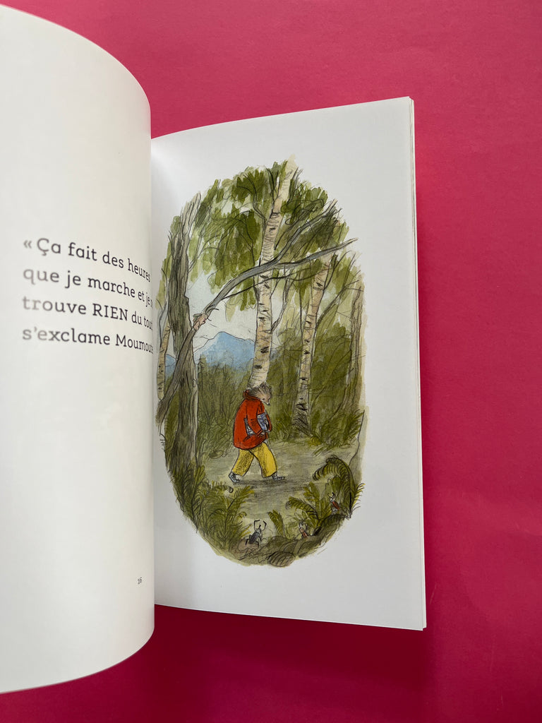 Moumoute est en vacances à la montagne, chez mamie. Elle lui a donné une boîte à biscuits, une boîte vide. Pour la remplir, le petit ourson part dans la forêt. Mais les trésors, ce n’est pas si facile à trouver.