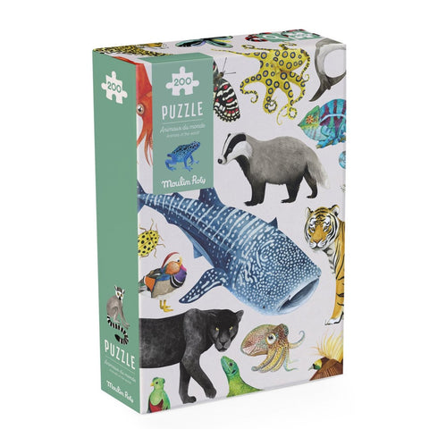 Puzzle d'observation 200 pièces. Une fois assemblé, identifie à qui appartiennent ces motifs ? Ces yeux ? Amuse-toi à retrouver les animaux cachés dans le décor du poster en utilisant la loupe pour t'aider.