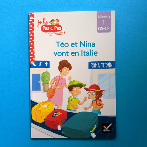 Gs CP Niveau 1. Avec Téo et Nina, apprends à lire pas à pas ! En suivant les aventures de Téo et Nina, votre enfant pourra apprendre et progresser en lecture, grâce aux 4 niveaux proposés. Il prendra confiance en lui et gagnera en autonomie au fil des niveaux. Il deviendra au terme du niveau 4 un lecteur confirmé. Que contient cette lecture ? Dans ce petit roman de niveau 1, adapté aux enfants de 5-6 ans, en Grande Section et début de CP, le jeune lecteur peut déchiffrer l'histoire entière dès ses premiers pas en lecture. » En effet, avant de débuter, des activités permettent de préparer l'enfant à la lecture. Des aides à la lecture sont proposées : Lettres muettes en gris Sons formés avec deux lettres (digrammes) en gras Les sons complexes sont soulignés et indiqués sous les lettres correspondantes Dans « Téo et Nina vont en Italie », Téo, Nina et Mona prennent l'avion pour Rome ! Rémi les attend à l'aéroport. Mais avant de le retrouver Téo, Nina et Mona doivent récupérer leurs valises sans se tromper !