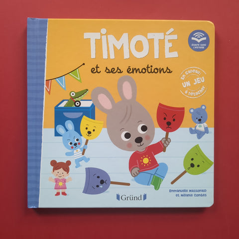 Timoté est un petit lapin qui, au fil des albums, partage sa vie avec ses copains et sa famille. Comme tous les petits de son âge, il découvre ses émotions : joie, peur, tristesse, jalousie, timidité. Heureusement, papa et maman sont là pour parler et l'aider à surmonter ses petits soucis de quotidien. En bonus, des petits jeux pour mettre des mots sur les émotions. Nouveau : votre enfant peut désormais écouter gratuitement la version audio de l'histoire via l'application Lizzie en scannant le QR code à retrouver dans le livre !